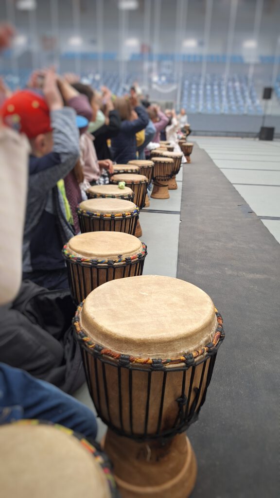 Wow, was für ein Start in unsere Trommelapplauswoche. Das Ankommen war super, alle haben ihre Djembe erhalten und es ging auch sofort los. Bernhard hat euch in den Bann gezogen. Die Sporthalle war heute ein Ort des gemeinsamen Trommeln, des Rhythmus und des Wow! Und denkt dran: „Übung macht die Meisterin und den Meister“. Morgen um 08:30 geht es weiter mit allen zusammen in der „Djembe-Arena“ am Johannisland.